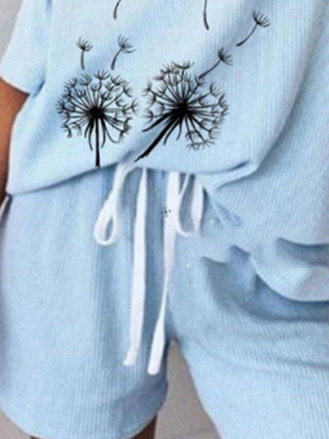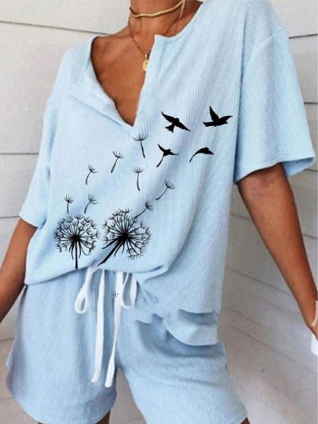 Women's Loungewear Sets Flower Fashion Casual Street Date Airport Polyester Breathable V Wire Short Sleeve T shirt Tee Shorts Summer Spring Blue